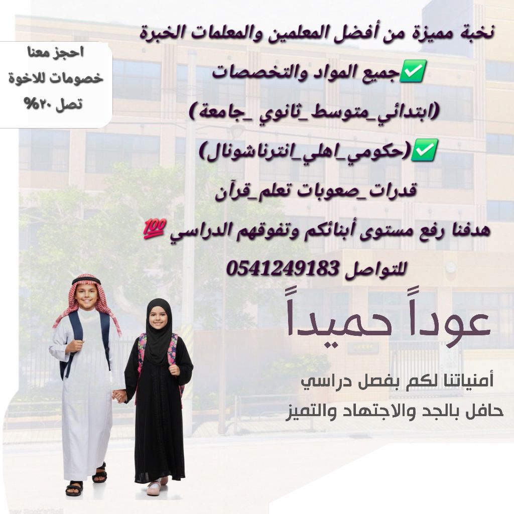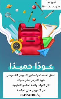يسرنا بكل حب أن نقدم لكم نخبة من المعلمين والمعلمات خصوصي في جميع أنحاء المملكة جميع التخصصات لكافة المراحل التعليمية ومتوفر في بيت الطالب / ه وعن بعد (تمهيدي - ابتدائي - متوسط - ثانوي - جامعة) عربي وانترناشونال) وللقدرات العامة والتحصيلي واختبار الرخصة المهنية ومتوفر لدينا أيضا أخصائيون وأخصائيات في صعوبات التعلم وتشتت انتباه والحالات الخاصه ومعلمات ومعلمين تحفيظ القرآن الكريم