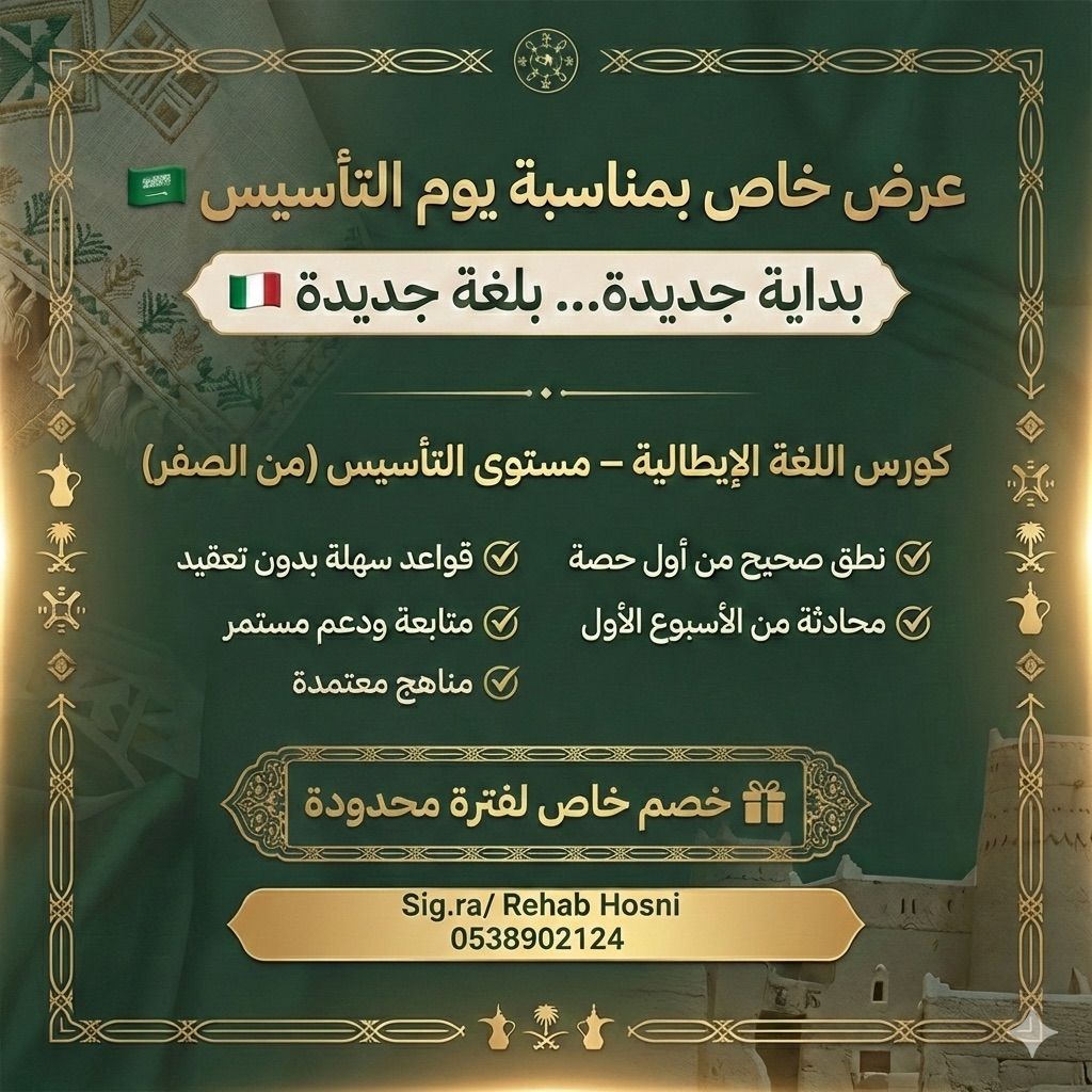 عرض خاص بمناسبة يوم التأسيس هل ترغب في تعلم اللغة الإيطالية أو العربية بطريقة سهلة وممتعة الآن فرصتك الذهبية مدرس بخبرة مميزة في تدريس اللغة الإيطالية والعربية لغير الناطقين بها. شرح مبسط - تأسيس قوي متابعة مستمرة. دروس حضورية أو اونلاين. خصم خاص بمناسبة يوم التأسيس لفترة محدودة سارع بالحجز واستفد من العرض قبل انتهاء المناسبة