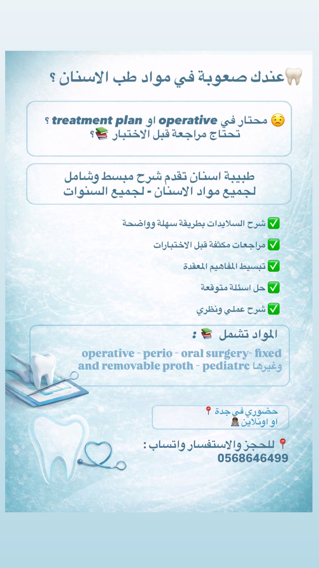 طبيبة أسنان تقدم شرح خاص لمواد طب الأسنان لجميع السنوات شرح المحاضرات بطريقة سهلة وواضحة تبسيط المفاهيم المعقدة مراجعات مكثفة قبل الاختبارات تأسيس من الصفر للطلاب الضعاف المواد تشمل Operative - Pediatric - Fixed & Removable Prostho - Perio - Oral Surgery وغيرها. حضوري في جدة أو اونلاين للتواصل