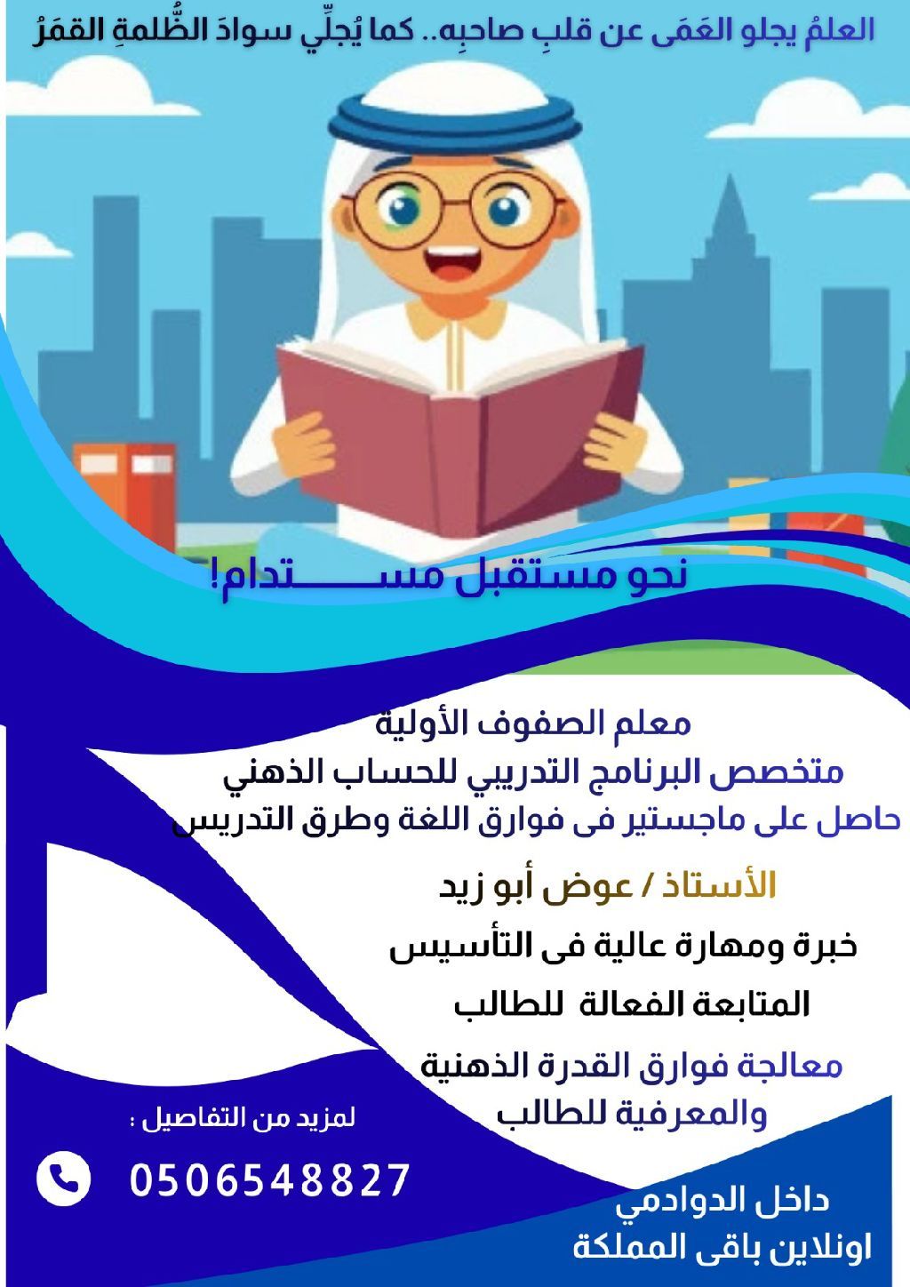 تأسيس طفلك صح يبدأ من هنا اعلن عن دروس خصوصية (متابعة وتأسيس) للصفوف الأولية، نركز على القراءة والكتابة، والحساب، بأساليب تعليمية حديثة وممتعة. شعارنا تعليم هادئ، تفوق دائم، وتأسيس يفتح آفاقا جديدة. للحجز والاستفسار اللغة العربية (التأسيس السليم + نور البيان + نون والقلم) الرياضيات (أسس الرياضيات + الحساب الذهني) الماث