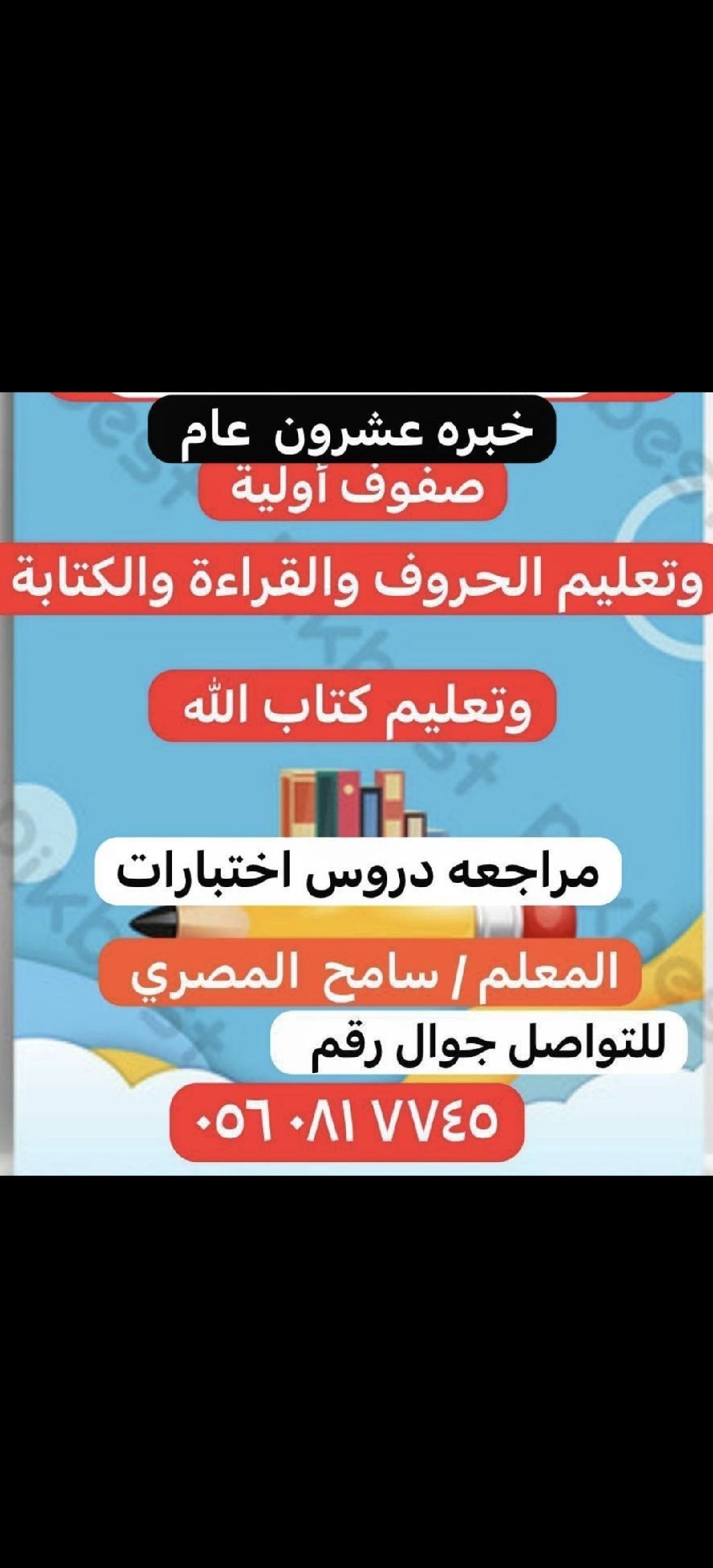 معلم صفوف أولية تأسيس قراءة وكتابة محفظ قرآن بالقواعد النورانية ونور البيان مجاز وحاصل على شهادات كثيرة خبرة 20 عاما