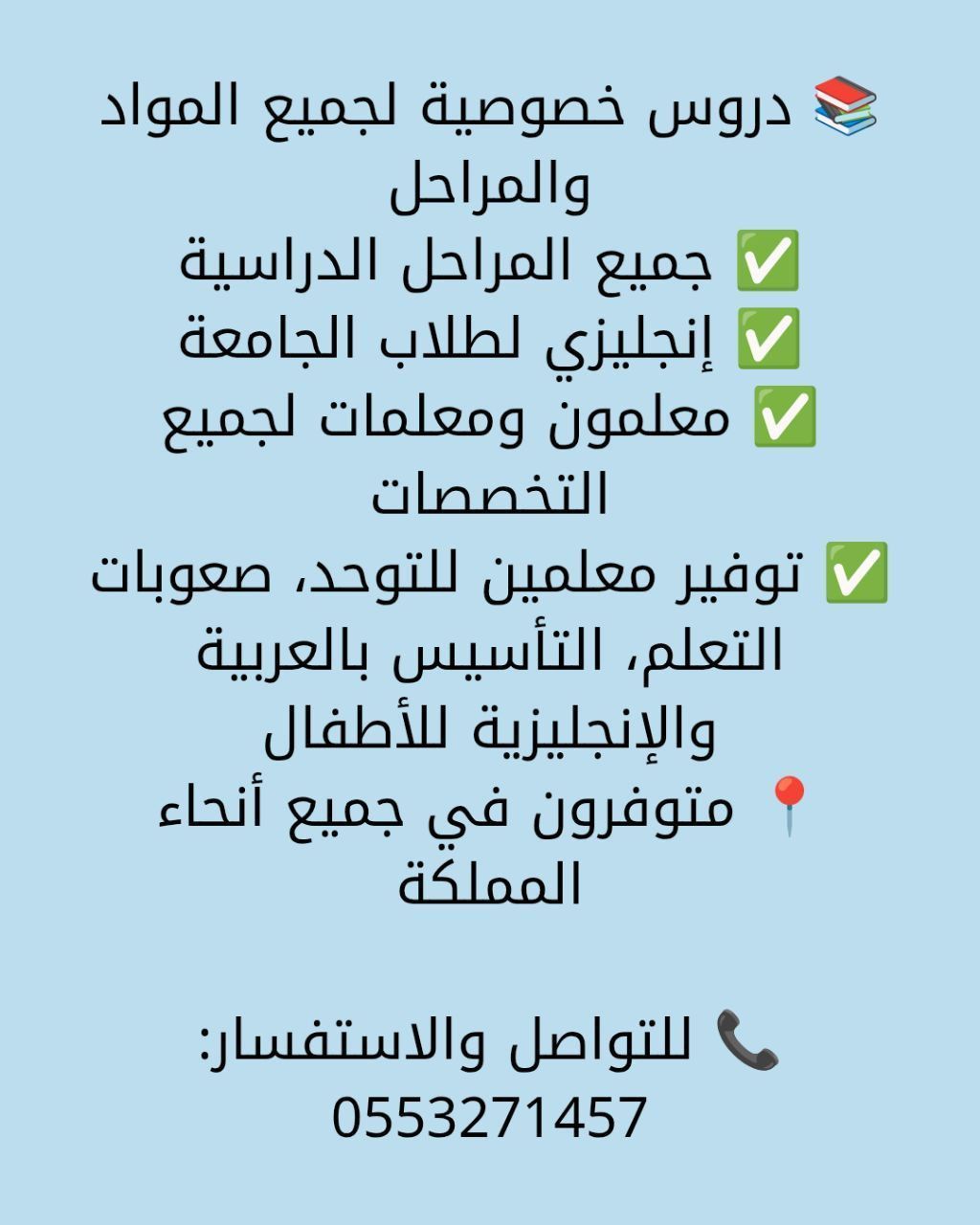 دروس خصوصية لجميع المواد والمراحل جميع المراحل الدراسية انجليزي لطلاب الجامعة معلمون ومعلمات لجميع التخصصات توفير معلمين للتوحد، صعوبات التعلم، التأسيس بالعربية والانجليزية للاطفال متوفرون في جميع أنحاء المملكة للتواصل والاستفسار