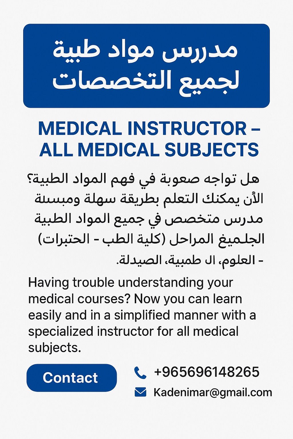 مدرس مواد طبية لجميع التخصصات هل تواجه صعوبة في فهم المواد الطبية الآن يمكنك التعلم بطريقة سهلة ومبسطة مع مدرس متخصص في جميع المواد الطبية لجميع المراحل (كلية الطب - التمريض - المختبرات - العلوم الطبية - الصيدلة) يقدم شرحا مفصلا ومبسطا في جميع المواد الطبية الأساسية مثل Anatomy - Physiology - Pathology - Biochemistry - Pharmacology - Microbiology - Histology - Immunology وغيرها