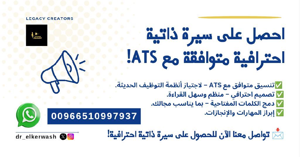 هل سيرتك الذاتية تجتاز أنظمة التوظيف الحديثة 80% من الشركات تستخدم ATS، مما يعني أن سيرتك الذاتية تحتاج الى تنسيق ذكي لتجاوز الفلاتر والوصول الى أصحاب العمل احصل على سيرة ذاتية احترافية متوافقة مع ATS كلمات مفتاحية لرفع فرصك تصميم واضح ومنظم جاهز للخطوة التالية تواصل معنا الآن
