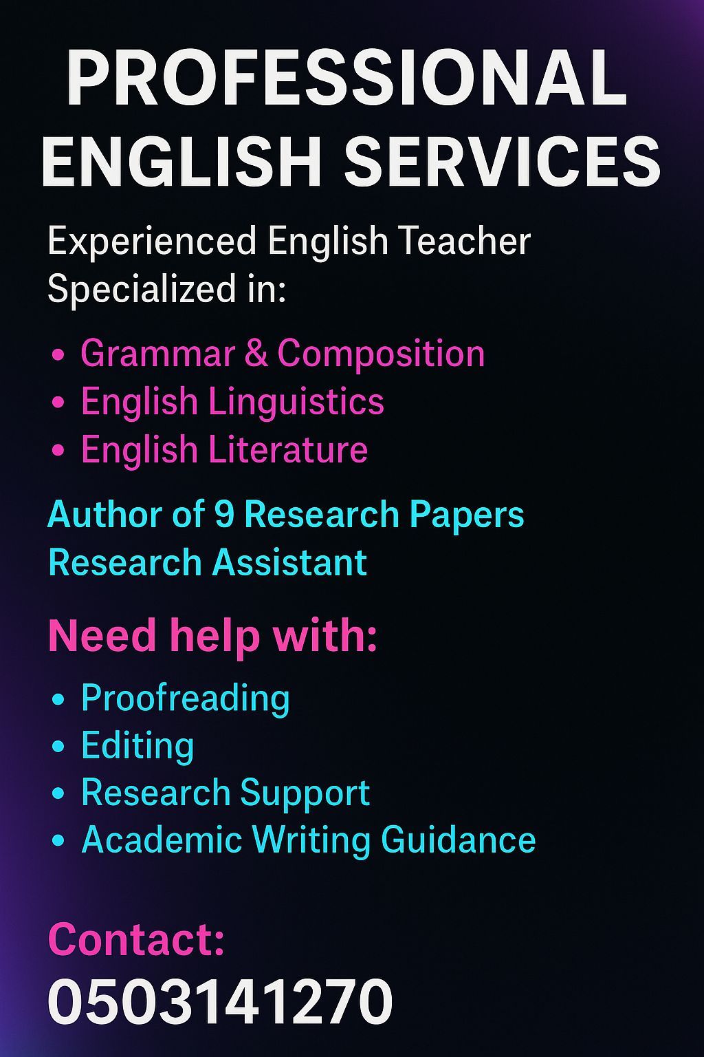 Professional English & Research Services Offering expert support in English Language Services Grammar & Composition Academic Writing Proofreading & Editing Essay, Assignment, and Report Support Linguistics & Literature Guidance Research Services Research Assistance Topic Refinement & Proposal Support Literature Review Development Data Interpretation & Analysis Guidance Research Paper