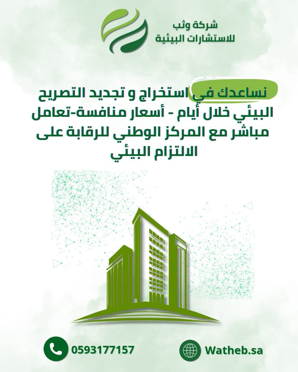 Watheb is an accredited consulting office ensuring your project's environmental compliance. We offer comprehensive environmental consultations obtaining an Environmental Permit, Environmental License, preparing an Environmental Impact Assessment (EIA) study, developing a complete Environmental Plan, and issuing a periodic Environmental Record. Environmental Audit study