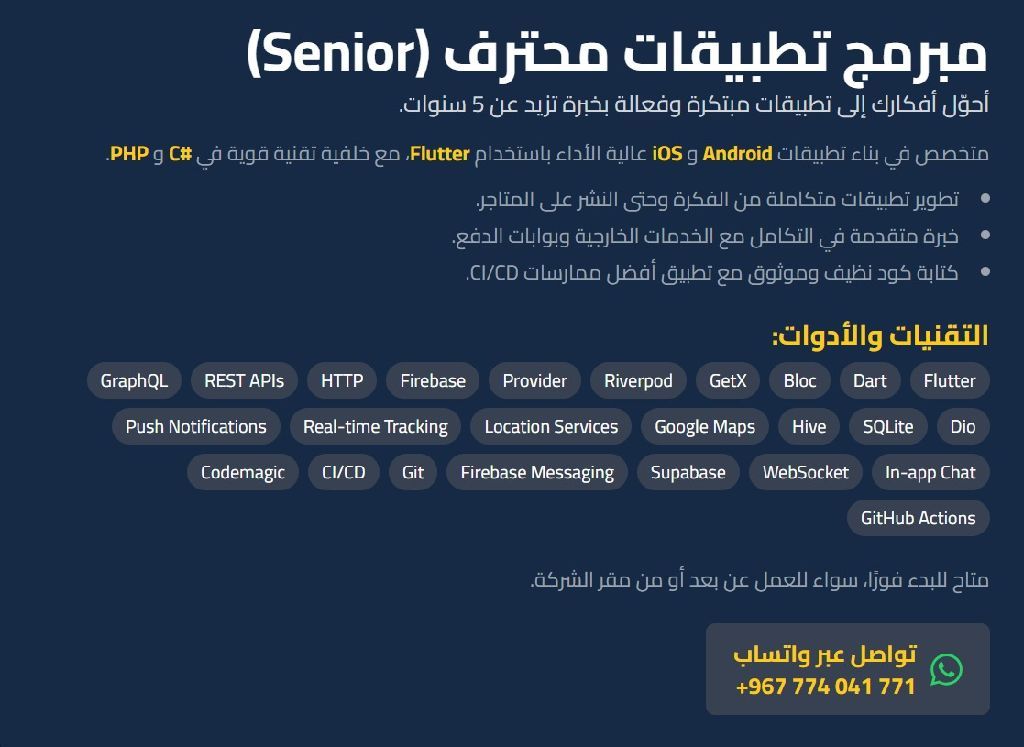 مبرمج تطبيقات (Senior) بخبرة 5 + سنوات في Flutter وPHP وASP. NET. متخصص في تطوير تطبيقات Android وiOS عالية الجودة وتكاملها مع الأنظمة الخارجية مثل هيئة الزكاة وبوابات الدفع. خبرة في Firebase، Dio، GraphQL، Riverpod، SQLite، Hive، وCI / CD باستخدام Codemagic وGitHub Actions. جاهز للعمل فورا عن بعد أو من مقر الشركة