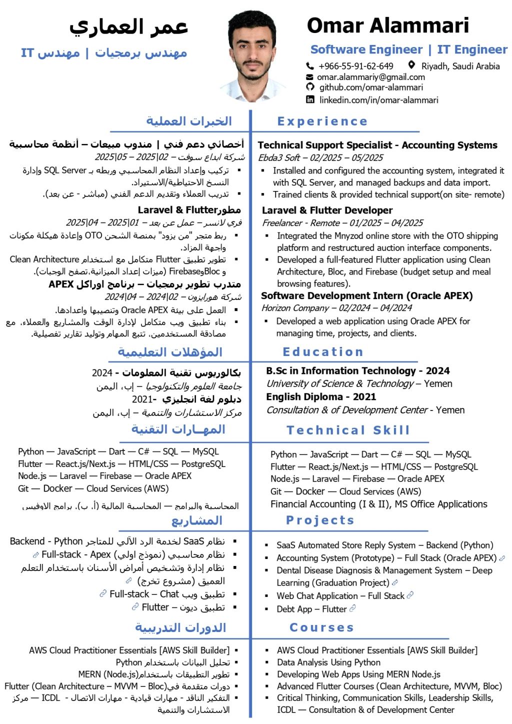 باحث عن عمل - مطور برمجيات (ويب & موبايل) مهندس IT / دعم فني. اسمي عمر عبدالعزيز، حاصل على بكالوريوس تقنية معلومات IT. امتلك الخبرة في تطوير وتصميم مواقع الويب (Laravel - Node. js - React) وتطوير تطبيقات الموبايل Flutter. الدعم الفني تركيب الأنظمة، وربط قواعد البيانات. العمل المحاسبي أساسيات المحاسبة وادخال البيانات والعمل على الأنظمة المحاسبية. جاهز للانضمام فورا