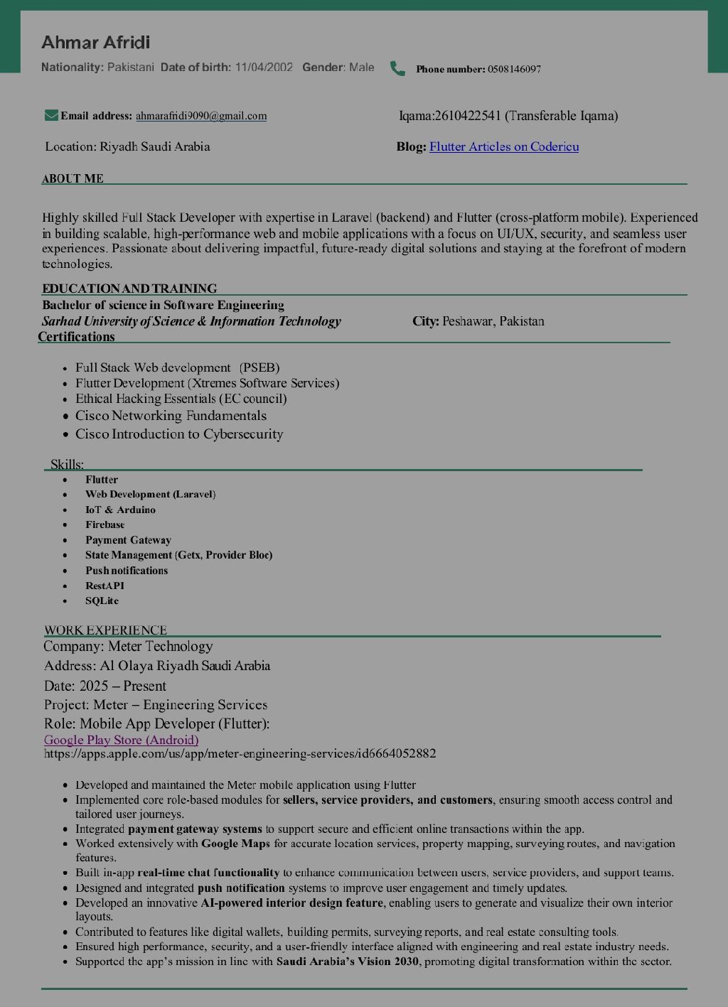 مطور تطبيقات جوال ماهر، متخصص في Flutter، ولديه خبرة 3 سنوات. خبرة في بناء تطبيقات جوال قابلة للتوسع وعالية الأداء، مع تركيز قوي على تصميم واجهة وتجربة المستخدم وتقديم تجربة استخدام سلسة. متمكن في REST APIs وFirebase والدردشة الآنية والاشعارات الفورية وتكامل خرائط Google. باحث عن وظيفة بدوام كامل