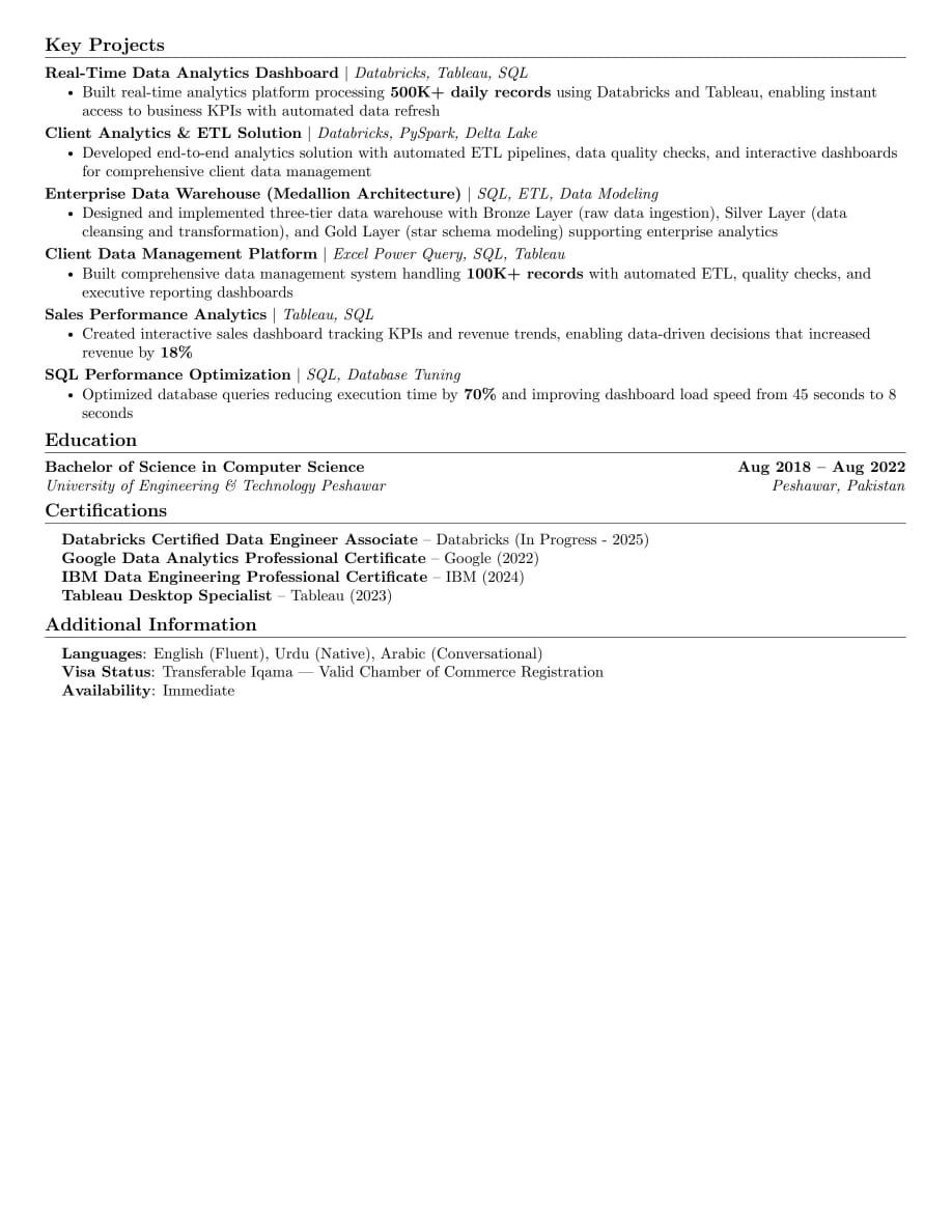 Professional Data Analyst 4 Years Experience Immediate Joiner Qualifications 4 years in Data Analysis & Business Intelligence Transferable Iqama + Chamber Registration Expert in SQL, Python, Tableau, Power BI, Excel Databricks & Spark experience Building dashboards & executive reports Achievements 30% cost reduction - 18% revenue increase - 25 + BI dashboards delivered Technica