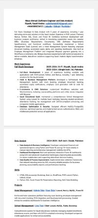 مطور برامج متكامل ومحلل بيانات بخبرة خمس سنوات، منها سنة واحدة في تقديم حلول متكاملة في السوق السعودي. يتمتع بخبرة في لغات البرمجة PHP، Laravel، Filament، Next. js، Python، SQL، Excel، وPower BI. يجمع بين التطوير التقني والكفاءة في تحليل الأعمال
