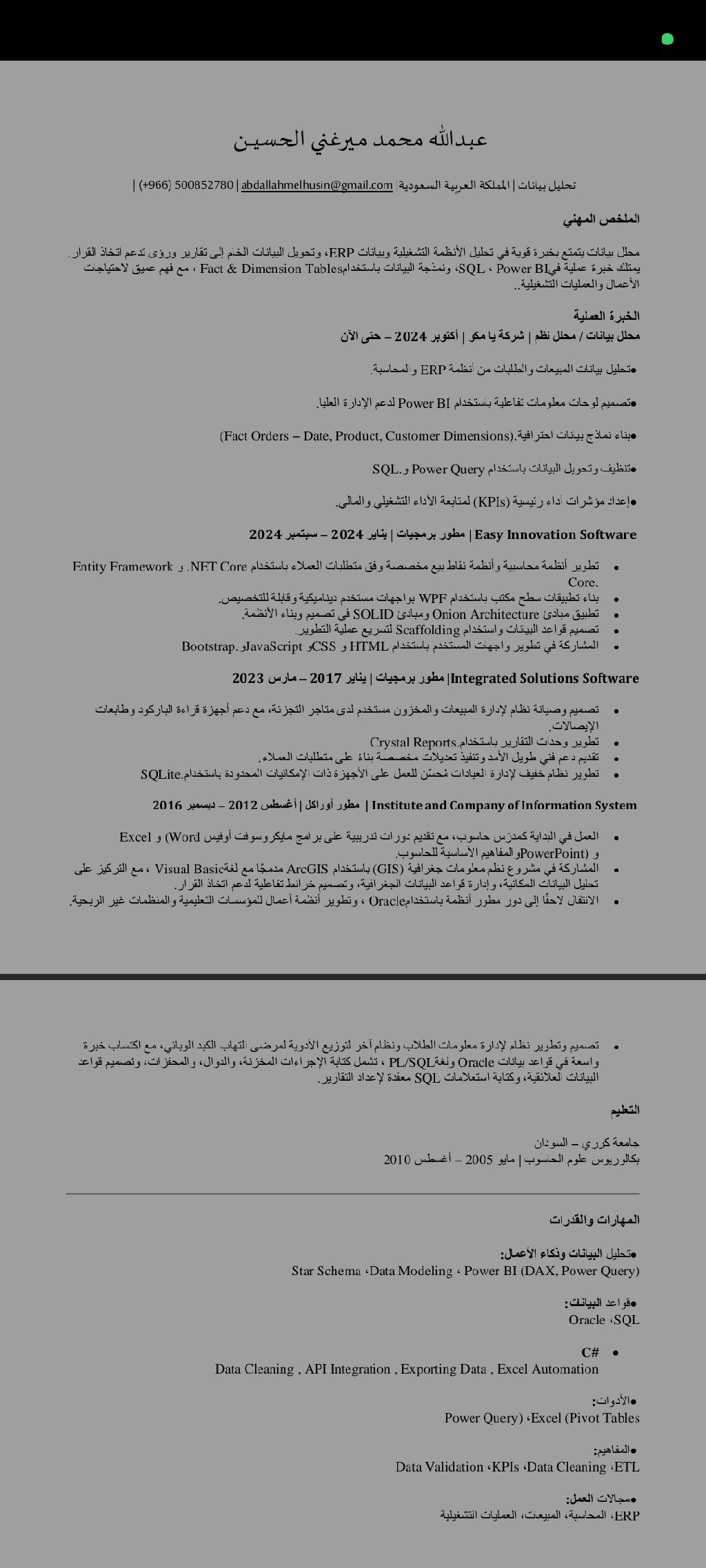 محلل بيانات امتلك خلفية تقنية قوية في قواعد البيانات وتطوير الأنظمة، مع خبرة في جمع البيانات وتنظيفها وتحليلها لاستخراج مؤشرات أداء تدعم اتخاذ القرار. أجيد العمل على SQL وExcel وPower BI في اعداد التقارير ولوحات المعلومات التفاعلية، ولدي قدرة على تحويل البيانات المعقدة الى رؤى واضحة تساعد الإدارة على تحسين الأداء وتقليل التكاليف. أتميز بالتفكير التحليلي، الدقة، وفهم متطلبات الأعمال