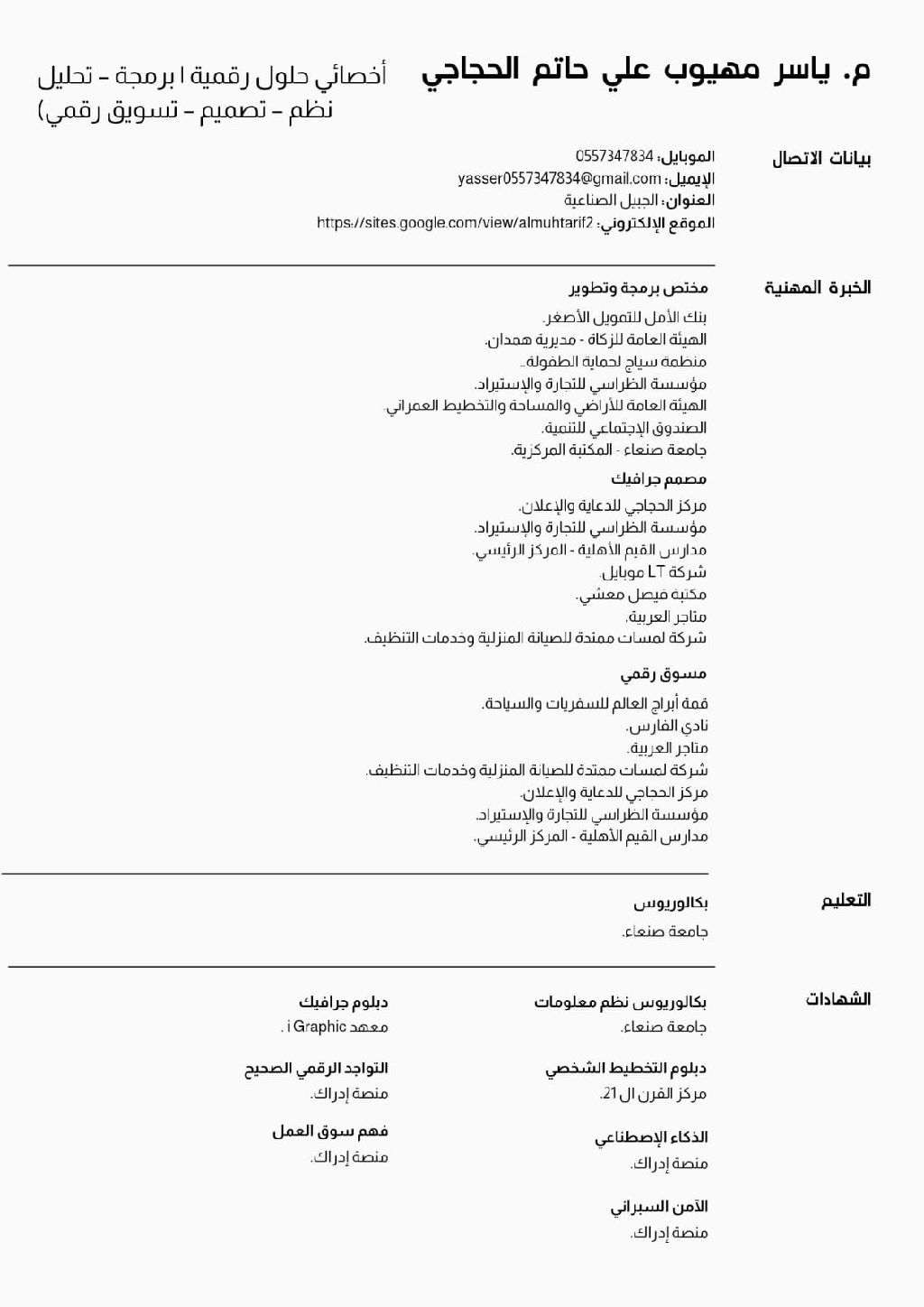 باحث عن عمل الدمام أخصائي تقنية وحلول رقمية برمجة تحليل نظم تصميم تسويق رقمي خبرة + 5 سنوات السلام عليكم، أنا متخصص في الحلول الرقمية مقيم في الدمام، ابحث عن وظيفة بدوام كامل في المنطقة الشرقية. أجمع بين مهارات البرمجة، التصميم، والتسويق الالكتروني لتقديم حلول رقمية متكاملة وقابلة للقياس خبرتي تجاوزت 5 سنوات في تحليل وبرمجة الأنظمة الادارية والمحاسبية تصميم الجرافيك وواجهات الم