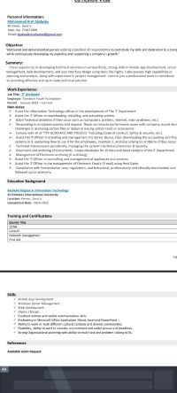 حديث التخرج بشهادة البكالوريوس في تقنية المعلومات من جامعة الامارات الدولية، واعمل حاليا كمساعد تقنية معلومات في مؤسسة تمكين للتنمية. امتلك خبرة عملية في دعم المستخدمين، إدارة العاملات منزليات (Windows Server) تركيب الأنظمة المحاسبية والمالية، وحل المشكلات التقنية للاجهزة والطابعات والشبكات