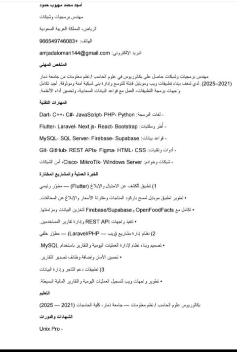 مطور ويب محترف بخبرة في تصميم وتطوير مواقع الويب والأنظمة باستخدام HTML, CSS, JavaScript, TypeScript, React, Next. js, Laravel, Node. js, ASP. NET Core ومتمكن من تصميم قواعد البيانات MySQL / PostgreSQL/ MongoDB. خبرة في بناء مواقع الشركات والمتاجر الالكترونية - تطوير REST APIs - تصميم لوحات تحكم وأنظمة مخصصة - تحسين الأداء وتجربة المستخدم - تحويل متطلبات الأعمال الى حلول قابلة للت