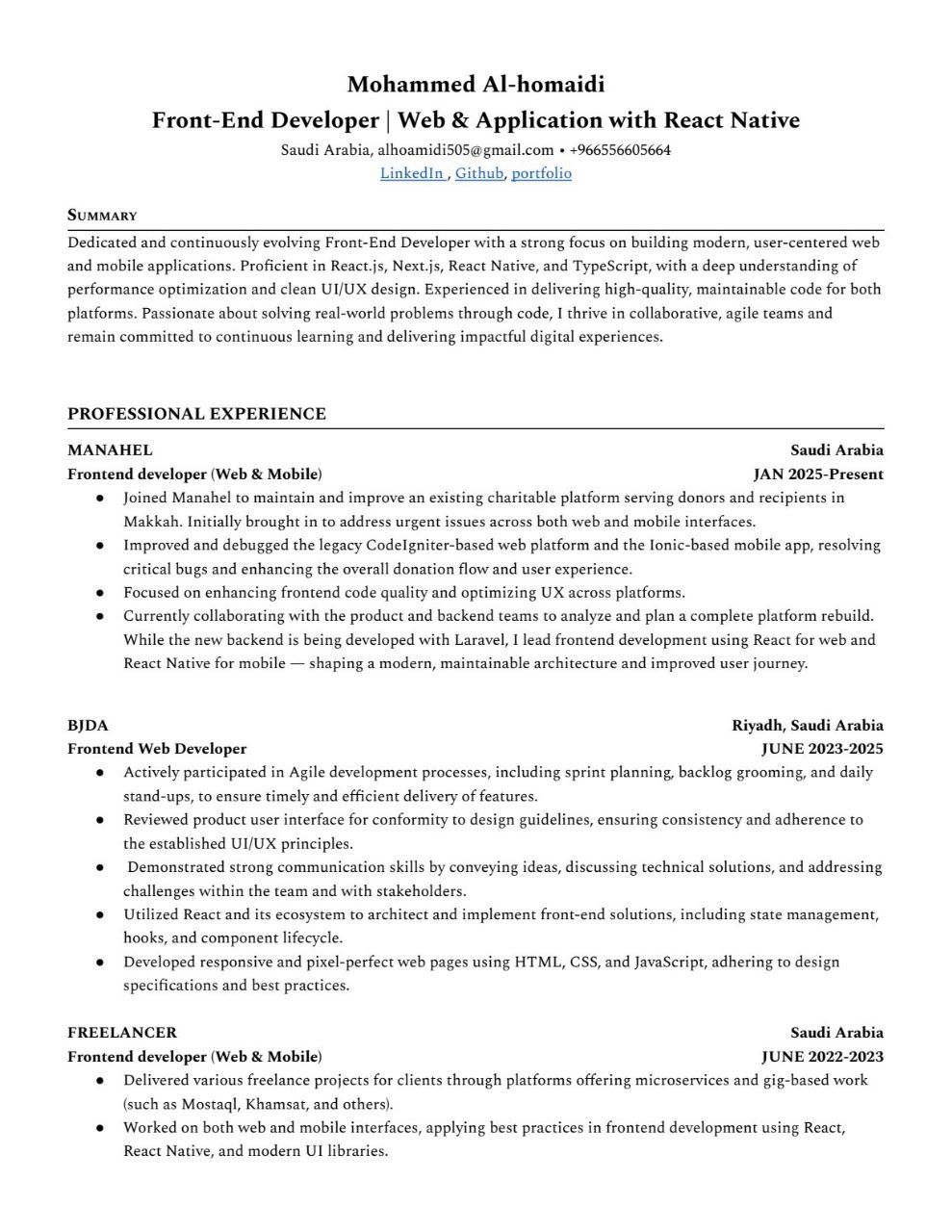 I am a Frontend Developer available for work, with strong experience in building websites and applications using React. js, Vue. js, React Native, Ionic, Next. js, and Tailwind CSS. I specialize in creating responsive and interactive user interfaces with a focus on enhancing user experience and efficiently integrating with APIs. I have a portfolio of completed projects across various fields