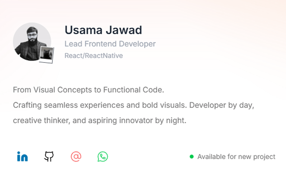 Web & Mobile Applications Developer with over 5 years of professional experience in building modern, responsive, and high - performance web and mobile applications using React. js, React Native, and Next. js. I specialize in frontend architecture, optimization and development. Website usamajawad. vercel. app