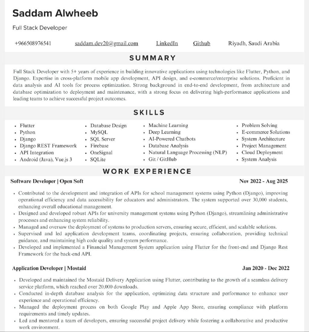 صدام الوهيب، مطور Backend & Frontend لدي خبرة تتجاوز 5 سنوات في تطوير أنظمة وخدمات الويب باستخدام Python, Django, Odoo بالاضافة الى تطوير تطبيقات موبايل احترافية باستخدام Flutter. أتميز بقدرتي على بناء حلول متكاملة سريعة، آمنة، وقابلة للتوسع سواء للأنظمة المؤسسية أو تطبيقات الموبايل، كما بدأت في مجال تطوير نماذج الذكاء الاصطناعي