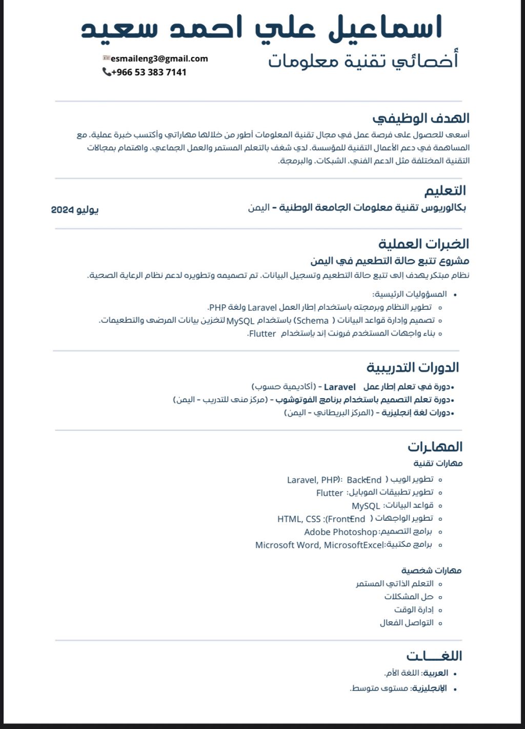 حاصل على بكالوريوس في تقنية المعلومات، أملك أساسيات جيدة في البرمجة وتطوير المواقع وأسعى لتطبيق مهاراتي في بيئة عمل تساعدني على التطور والنمو المهني. طموحي أكون جزء من فريق يهتم بالابداع التقني والتطوير المستمر