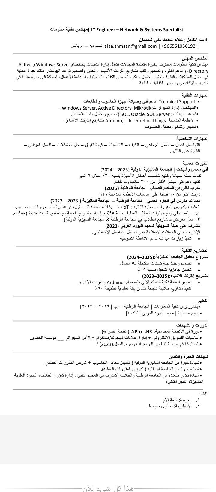 I am Alaa Shamsan, a Yemeni national with a Bachelor's degree in Information Technology. I am seeking employment and possess experience in network administration, technical support, and system and server administration (Windows Server, Active Directory, Mikrotik, SQL) I am passionate about developing technical solutions and improving system efficiency, and I have strong teamwork and problem - solvi