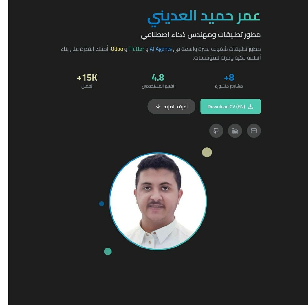 ابحث على وظيفة أو عمل إظافي مهندس برمجيات ومطور ومبرمج تطبيقات جوال، تطبيقات ويب وبرامج odoo مع برمجة بوتات ذكاء اصطناعي لرد على العملاء وتس، خبرة 6 سنوات الغات البرمجية c flutter, React, native, html, css, js, Next. js, Node. js, Python