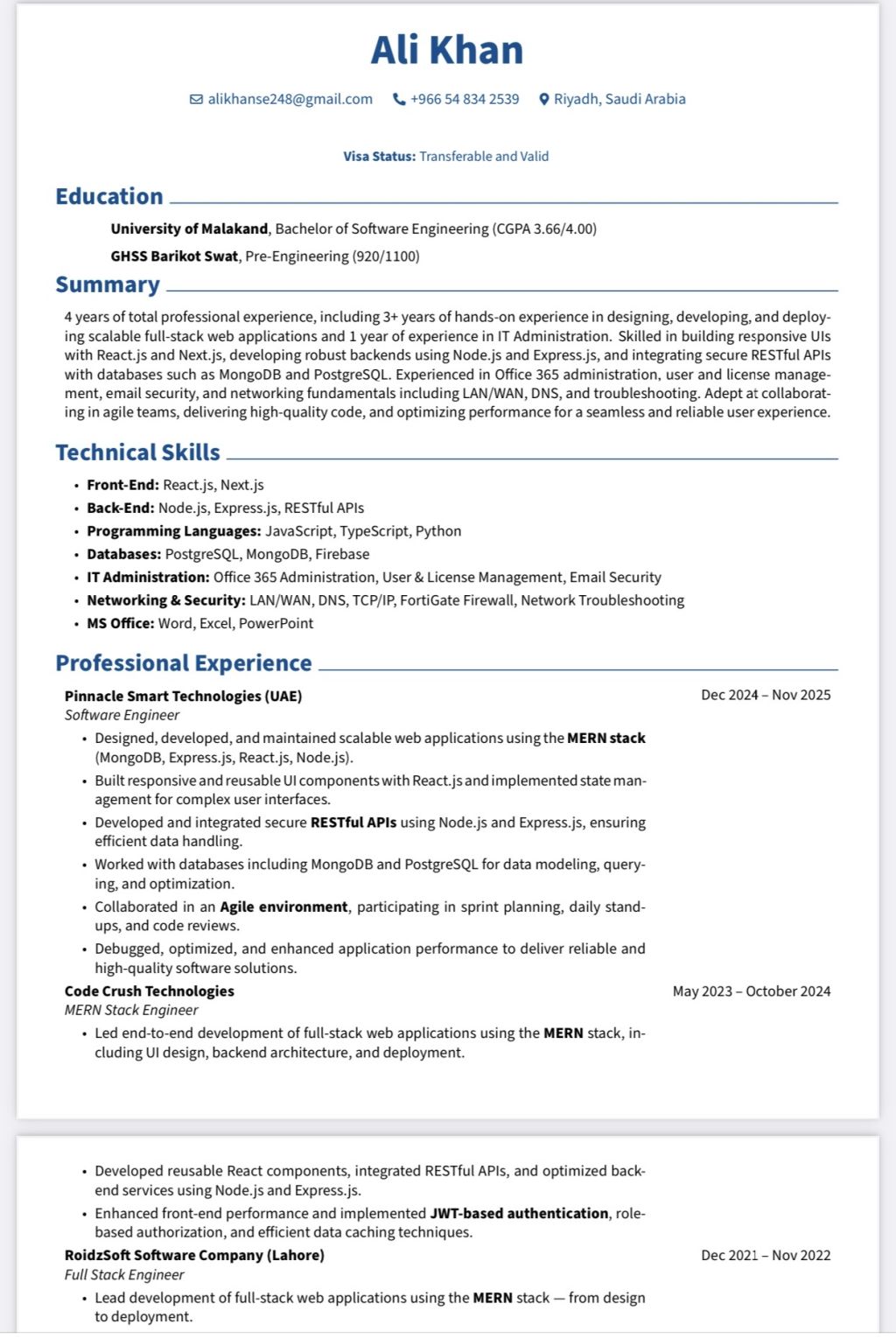 Are you looking for a developer who can build more than just a website I am a Senior MERN Stack Developer with 4 + years of professional experience. Frontend React. js, Next. js, Tailwind CSS (Expert) HTML 5/ CSS3. Backend Node. js, Python, JavaScript, Typescript, Express. js. Database MongoDB, PostgreSQL. Transferable Iqama