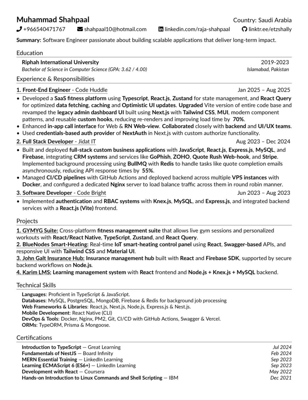 An Experienced Full Stack Developer Looking for a full time position, skilled in Node. js, Express, NestJS, REST APIs, Socket. io, MySQL, PostgreSQL, Prisma, TypeORM, Docker, Nginx, and Firebase. Strong in React, Next. js, Tailwind, and building scalable, secure, high - performance systems with clean architecture