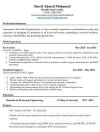 SOC Analyst (Tier 1) Open to Work Experienced in monitoring security alerts, log analysis, threat detection, and incident response. Hands - on with SIEM tools such as QRadar and Splunk, with a solid foundation in network security and phishing analysis. Seeking an opportunity to grow my skills and help strengthen organizational security. Passionate about continuous learning and teamwork