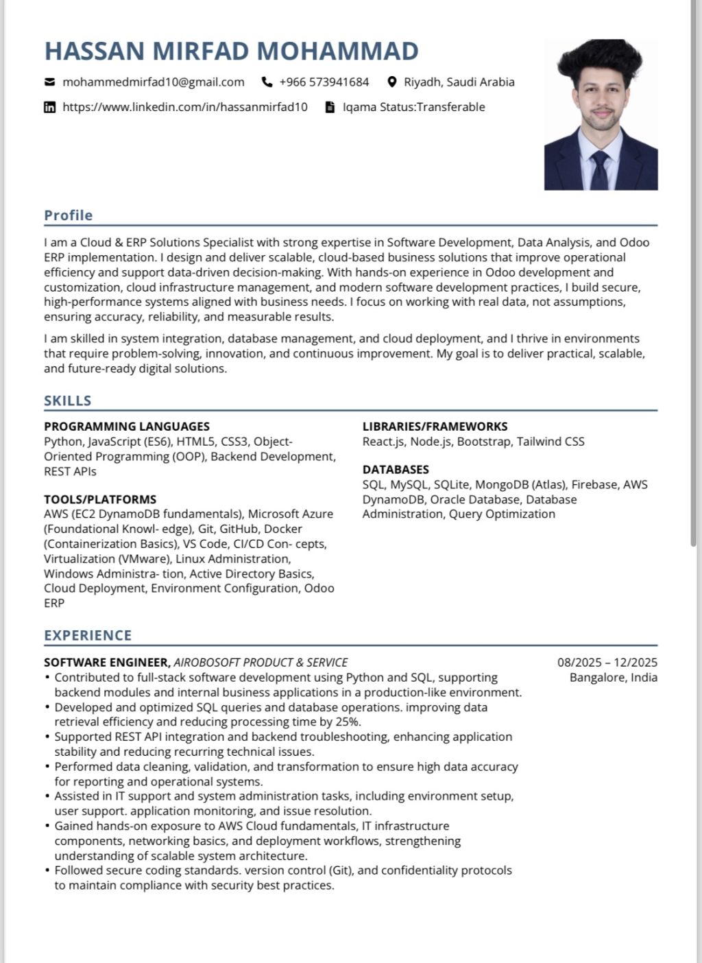 Bachelor’s graduate in Computer Science with skills in Python, SQL, backend development, and basic AWS cloud knowledge. Experience in IT support, data handling, and system troubleshooting. Hardworking, honest, and quick learner. Currently in Riyadh with transferable Iqama and ready to join immediately. Seeking opportunities in IT, Software, or Data roles