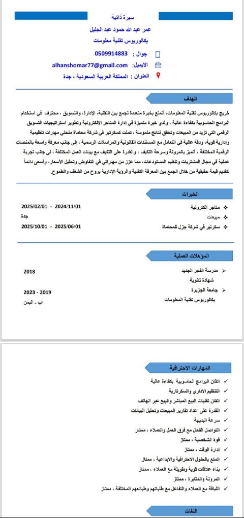 خريج بكالوريوس تقنية معلومات أتمتع بخبرة متنوعة تجمع بين التقنية، الإدارة، والتسويق محترف في استخدام البرامج الحاسوبية وإدارة المتاجر الالكترونية والتسويق الرقمي. عملت كسكرتير في شركة محاماة مما عزز مهاراتي التنظيمية والدقة. لدي معرفة واسعة بالمنصات الرقمية، وخبرة في المشتريات وتنظيم المستودعات، وأتميز بالمرونة، سرعة التكيف، وتحقيق نتائج ملموسة