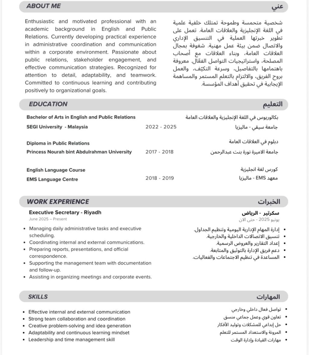 متخصصة في العلاقات العامة والتواصل المؤسسي تمتلك خبرة عملية في التنسيق الاداري تنظيم الاجتماعات إدارة المراسلات واعداد التقارير مع مهارات عالية في التواصل الداخلي والخارجي وبناء العلاقات المهنية والقدرة على العمل ضمن فريق وتحقيق أهداف الجهة بكفاءة. التواصل عبر البريد الألكتروني