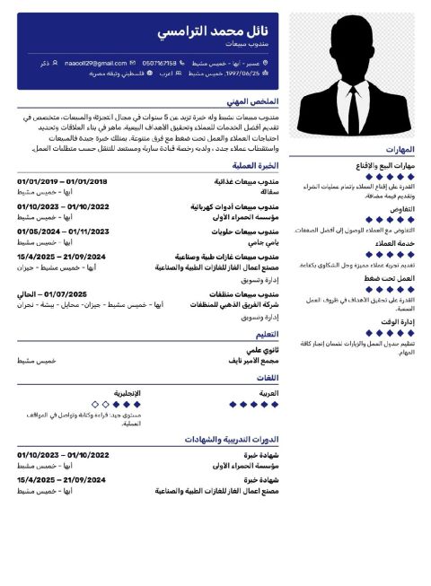مندوب مبيعات فلسطيني العمر 27 مواليد خميس مشيط خبرة فالمبيعات والتسويق لأكثر من 5 سنوات في مجالات متعددة مواد غذائية وأدوات كهربائية ومصنع غازات طبية وصناعية ومصنع منظفات لدي قاعدة عملاء في المجال الطبي مستشفيات خميس مشيط وأبها وجازان وأيضا قاعدة عملاء في مجال المنظفات والبلاستيك في خميس مشيط وأبها