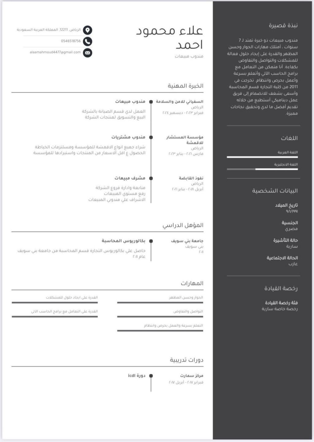 مندوب مبيعات ذو خبرة تمتد ل 7 سنوات امتلك مهارة الحوار وحسن المظهر والقدرة ع ايجاد حلول فعاله للمشاكل والتواصل والتفاوض بكفاءة والعمل بحرص وانتظام
