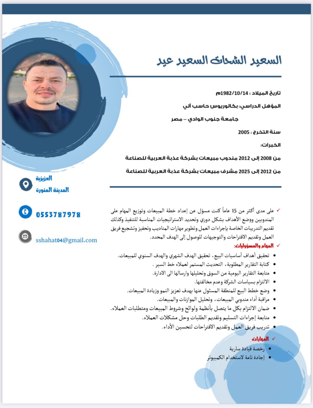 ابحث عن وظيفة عمل في مجال المبيعات أكثر من 15 سنة خبرة في المبيعات وعلى دراية كاملة بخطوط سير المدينة المنورة والسوق المركزي (تجار الجملة) والمنطقة المركزية حول الحرم