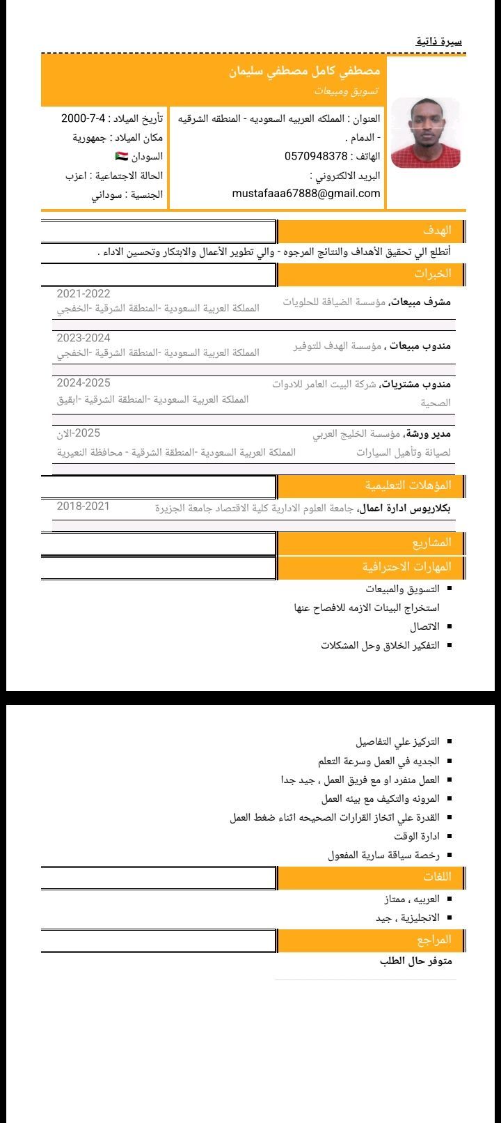 سوداني الجنسية العمر 25 سنة مندوب مبيعات ومسوق محترف ابحث عن عمل داخل الخفجي