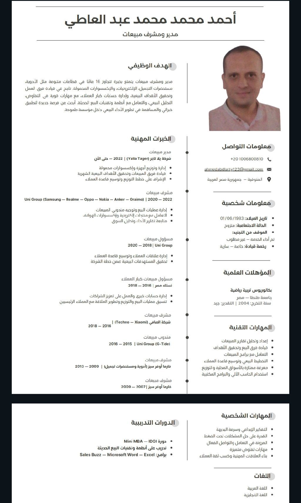 أحمد مصري الجنسية مقيم في الرياض خبرة جيدة جدا بالمبيعات والتسويق ووضع خطط بيعية وامتلاك مهارات عديدة وقوية في فن البيع والتسويق وتحقيق المستهدف خبرة في مجالات عديدة وقوية والعمل في أكبر البرندات الجوالات بأكسسواراتها وخبرة جيدة جدا بأسواق الرياض ابحث عن فرصة عمل لتطبيق خبراتي والمساهمة في تطوير الأداء البيعي داخل مؤسسة طموحة