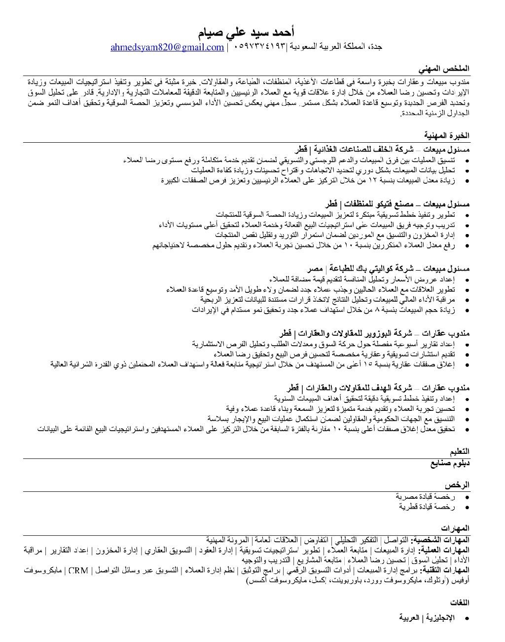 مندوب مبيعات وعقارات بخبرة واسعة في قطاعات الأغذية المنظفات الطباعة والمقاولات. خبرة مثبتة في تطوير وتنفيذ استراتيجيات المبيعات وزيادة الايرادات وتحسين رضا العملاء من خلال إدارة علاقات قوية مع العملاء الرئيسيين والمتابعة الدقيقة للمعاملات التجارية والادارية قادر على تحليل السوق وتحديد الفرص الجديدة وتوسيع قاعدة العملاء بشكل مستمر. سجل مهني يعكس تحسين الأداء المؤسسي وتعزيز الحصة السوقية وتحقيق أهدا