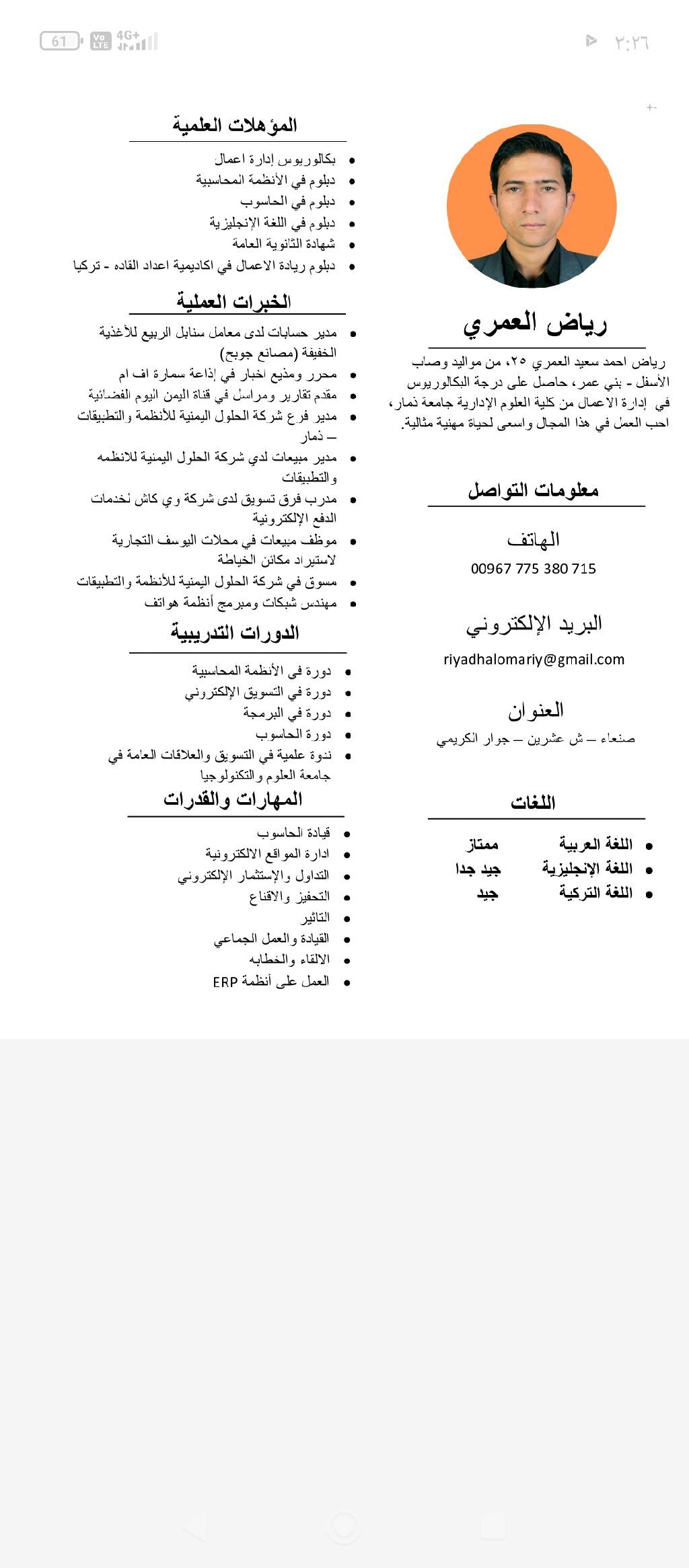 المؤهلات العلمية بكالوريوس إدارة أعمال دبلوم في الأنظمة المحاسبية دبلوم في الحاسوب دبلوم في اللغة الانجليزية شهادة الثانوية العامة دبلوم ريادة الأعمال في أكاديمية اعداد القادة - تركيا الخبرة العملية مدير حسابات لدى معامل سنابل الربيع للأغذية لايت (مصانع جويح) محرر ومذيع أخبار في اذاعة سماره أف أم مقدم تقارير ومراسل في قناة اليمن اليوم الفضائية مدير فرع شركة الحلول اليمنية للأنظمة مدير