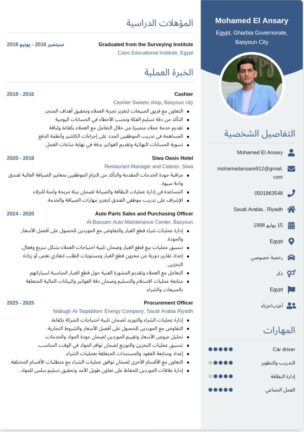 مصري عمري 27 عام لدي رخصة قيادة وإقامة سارية ابحث عن فرصة عمل عملت من قبل في أكثر من مجال منهم محلات الحلويات وقطع غيار السيارات وعملت مسؤول مشتريات في شركة مقاولات عامة