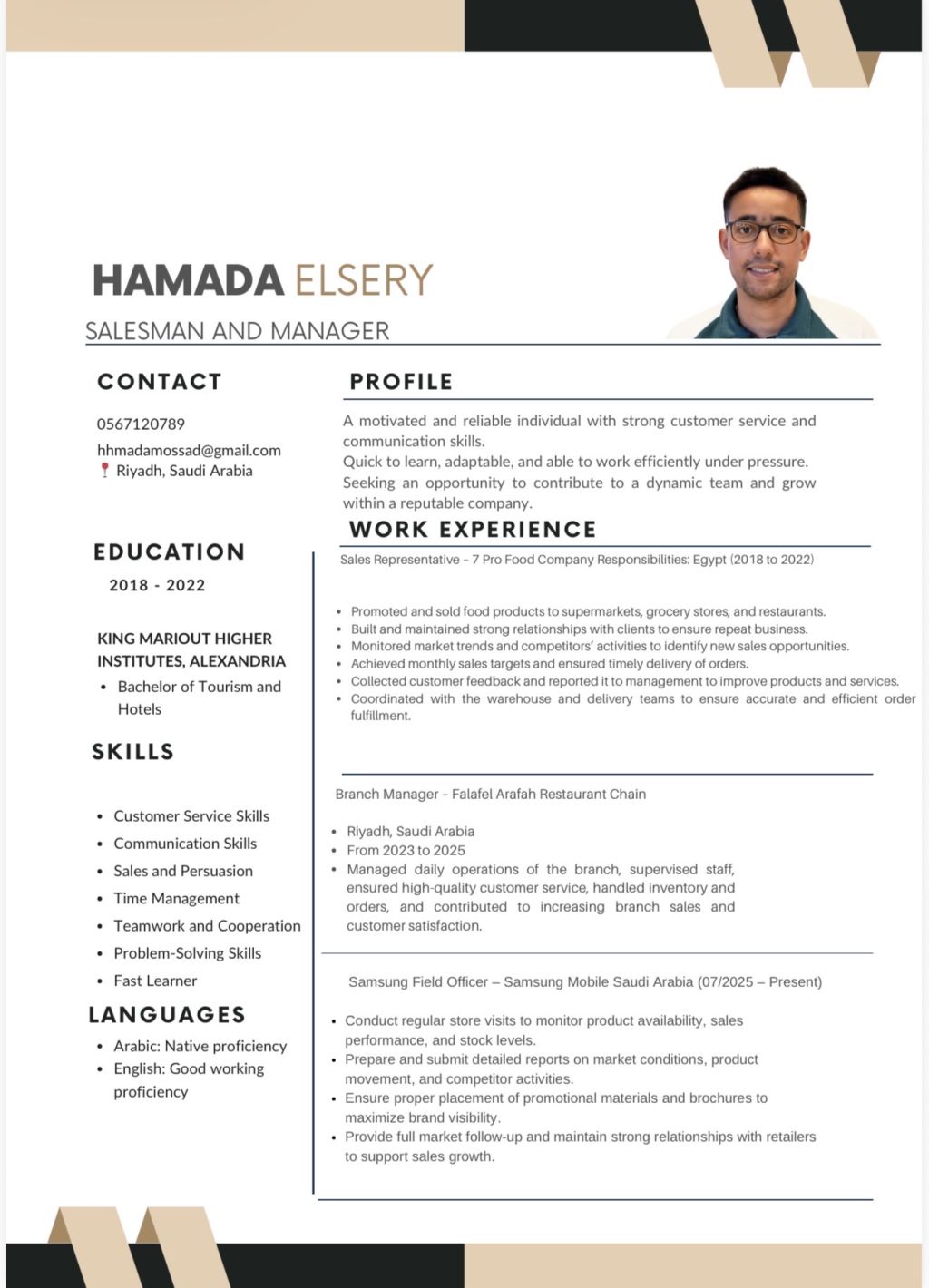 شاب مصري 26 سنة، حاصل على بكالوريوس سياحة وفنادق. امتلك خبرة قوية في مجال المبيعات وخدمة العملاء والإدارة والتشغيل. سبق لي العمل داخل المملكة كمدير لفرع مطعم فلافل معروف، وحاليا اعمل مطور مبيعات لدى شركة سامسونج للجوالات. ابحث عن فرصة عمل مناسبة في الرياض، وجاهز للانضمام فورا