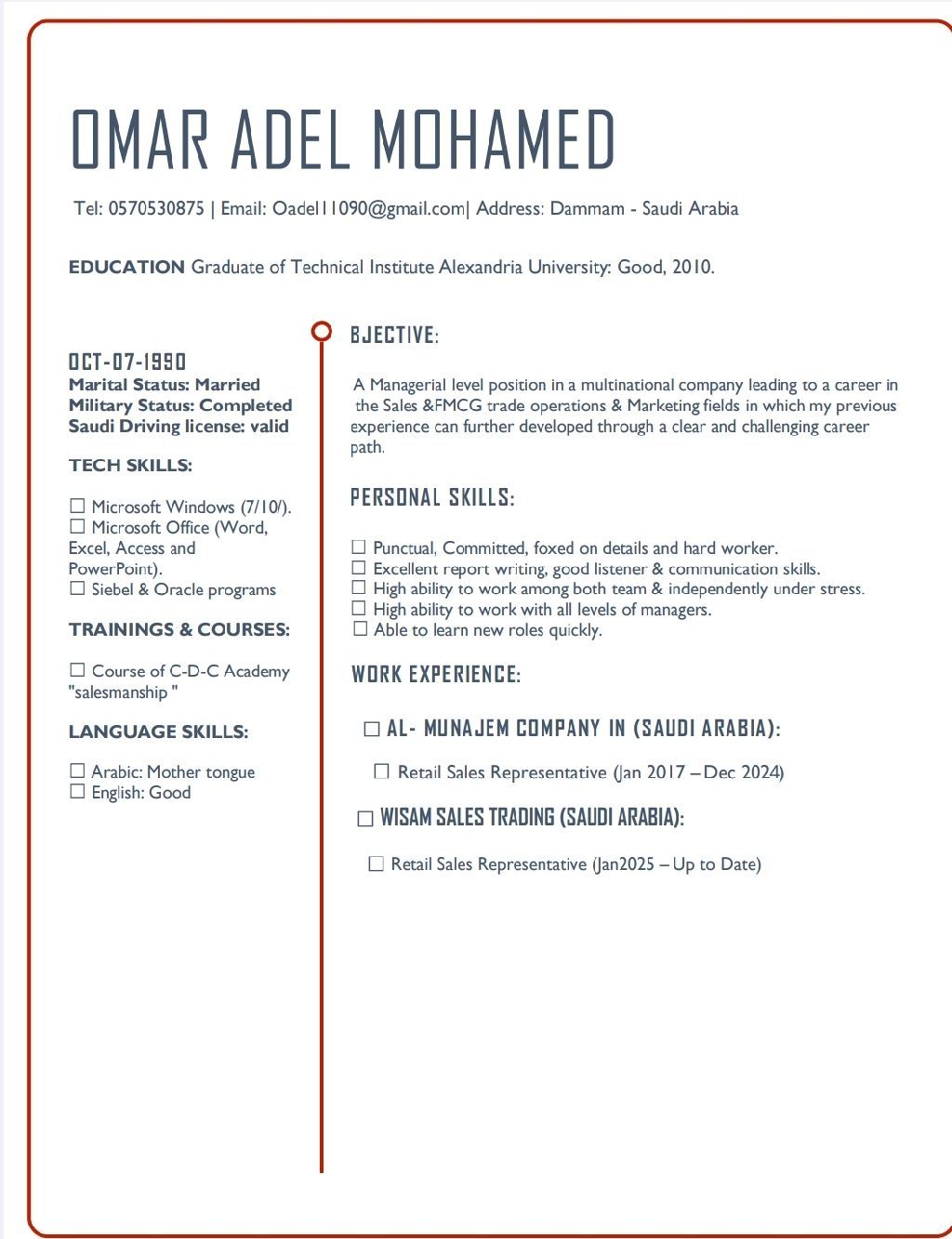 ابحث عن فرصة عمل في مجال المبيعات، حيث امتلك خبرة عملية تزيد عن 10 سنوات في قطاع المبيعات والعمل الميداني. عملت لمدة 8 سنوات لدى شركة المنجم للأغذية، واعمل حاليا في شركة وسام البيع للمواد الغذائية (بالشرف سابقا - Retail) امتلك مهارات قوية في بناء وتطوير قاعدة العملاء / تحقيق أهداف البيع / إدارة المناطق البيعية / متابعة التحصيل وتنفيذ الخطط البيعية / التعامل مع الأنظمة البيعية وتنظيم خط السير