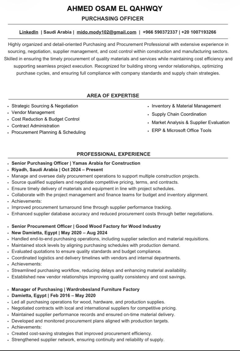 ابحث عن عمل لدى شركة مقاولات مسؤول مشتريات وعقود خبرة 7 سنوات في شركات المقاولات في السعودية وذلك في مجال المشتريات لإدارة احتياجات المشاريع وسلاسل الأمدادولدى قاعدة موردين ومقاولين لتلبية كل الاحتياجات بأسعار تنافسية للمشاريع الحكوميه ومشاريع التطوير العقاري والبناء والانشاءات مع خبرة احترافية في التفاوض على الأسعار وفي صياغة عقود مقاولين الباطن والحفاظ على توفير التكاليف وعمل خطط لمشتريات مشاريع