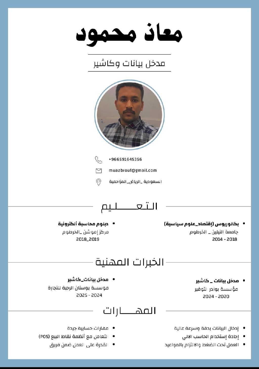 ابحث عن عمل سوداني الجنسية العمر 28 عاما مقيم في الرياض خبرة 5 سنوات في ادخال البيانات والعمل ككاشير ملتزم وجاد في العمل وأتحمل ضغط العمل اسأل الله أن يرزقني ويرزقكم من واسع فضله