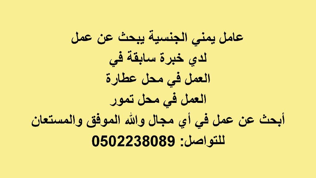 عامل يمني الجنسية يبحث عن عمل لدي خبرة سابقة في العمل في محل عطارة العمل في محل تمور ابحث عن عمل في أي مجال