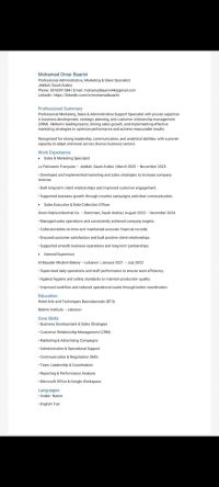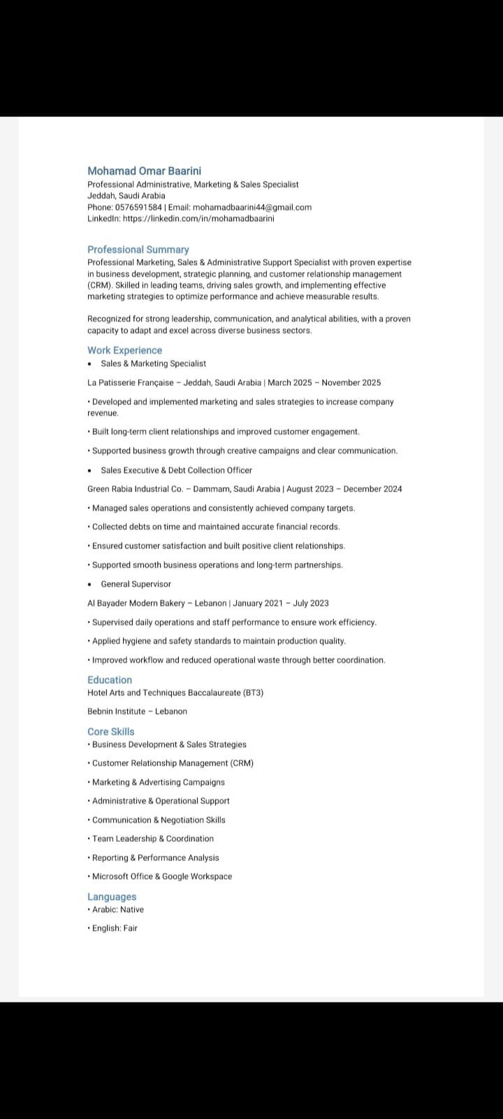 شاب لبناني ابحث عن وظيفة مقيم في جدة رخصة قيادة إقامة سارية. محترف تسويق ومبيعات ودعم اداري محترف يتمتع بخبرة مثبتة في تطوير الأعمال والتخطيط الاستراتيجي وإدارة علاقات العملاء (CRM) يتمتع بمهارة في قيادة الفرق ودفع نمو المبيعات وتنفيذ استراتيجيات تسويقية فعالة لتحسين الأداء وتحقيق نتائج قابلة للقياس معروف بقدراته القوية في القيادة والتواصل والتحليل مع قدرة مثبتة على التكيف والتفوق في مختلف الأعمال