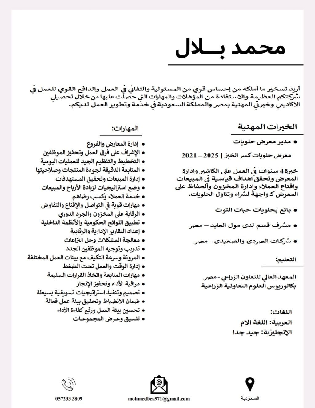 ابحث عن عمل بأي مكان في السعودية خبرة 5 أعوام بمجال المبيعات في محلات الحلويات ولدي مهارة قوية وخبرة في التسويق والتعامل مع العملاء بشكل راقي