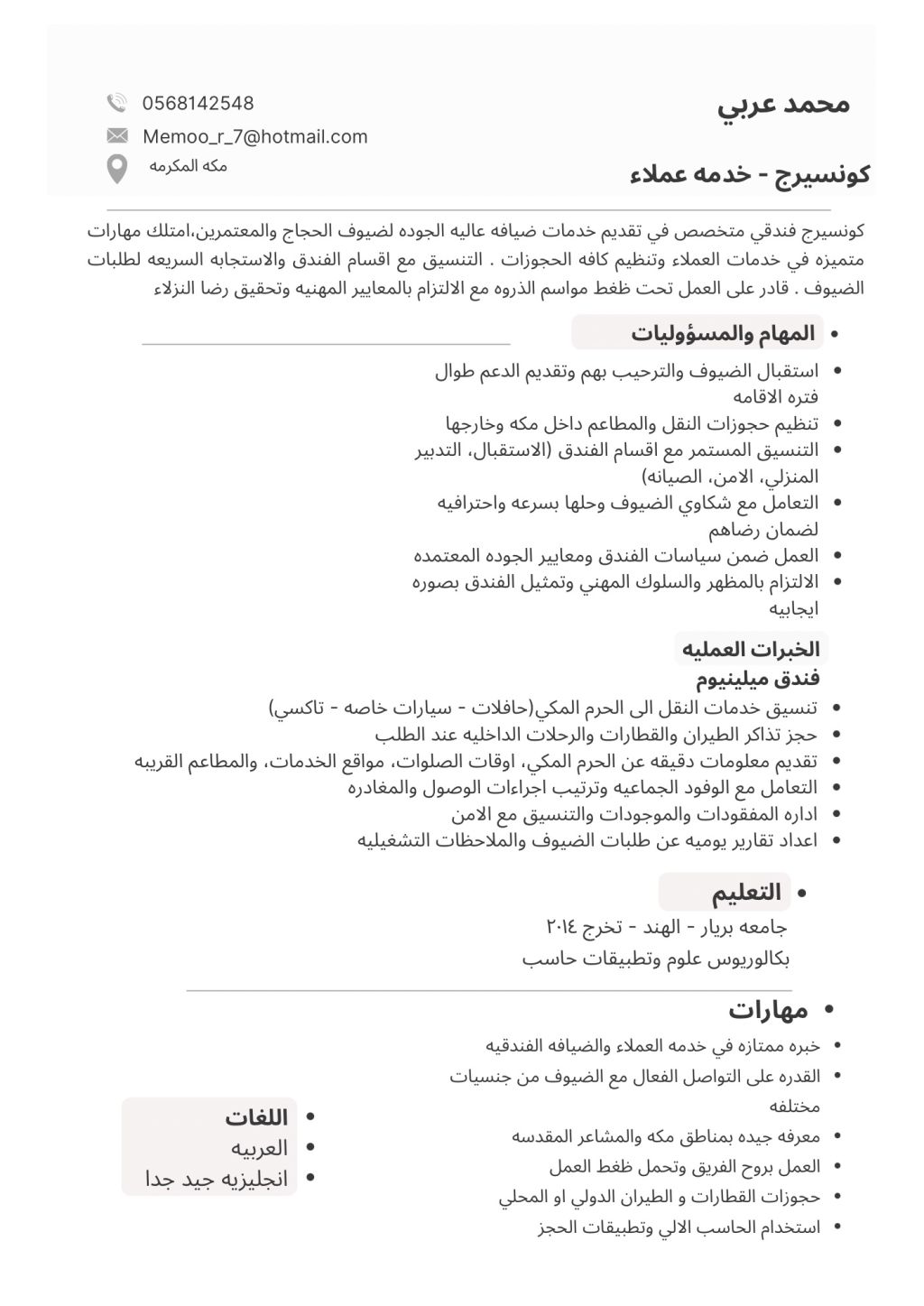 كونسيرج فندقي متخصص في تقديم خدمات ضيافة عالية الجودة لضيوف الحجاج والمعتمرين، امتلك مهارات متميزه في خدمات العملاء وتنظيم كافة الحجوزات. التنسيق مع أقسام الفندق والاستجابة السريعه لطلبات الضيوف. قادر على العمل تحت ضغط مواسم الذروة مع الالتزام بالمعايير المهنية وتحقيق رضا النزلاء