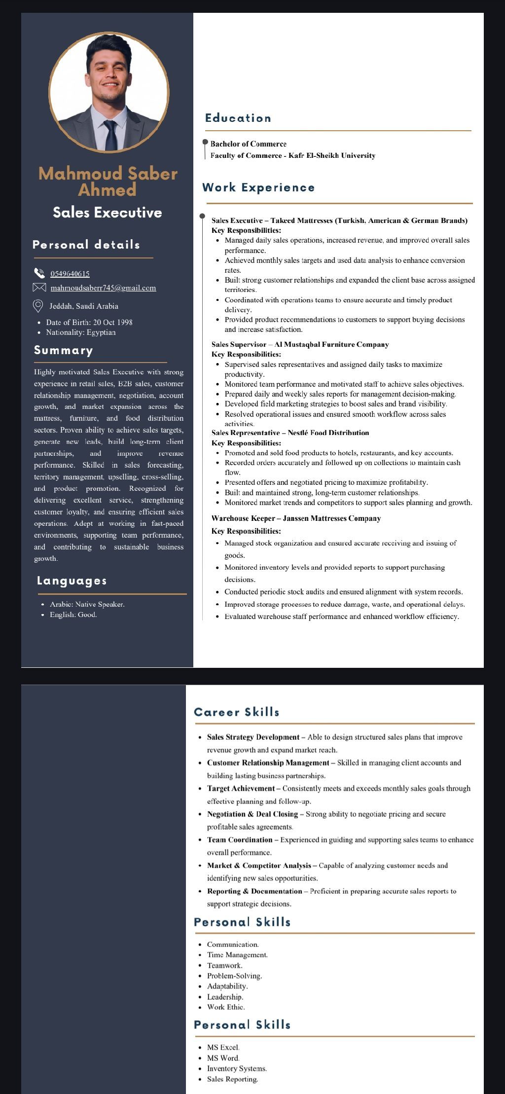 الجنسية مصري السن 27 سنة حاصل ع بكالوريوس تجارة محاسبه لدي خبرة في مجال المبيعات أجيد السواقة لدي اقامة سارية سنة مقيم في جدة