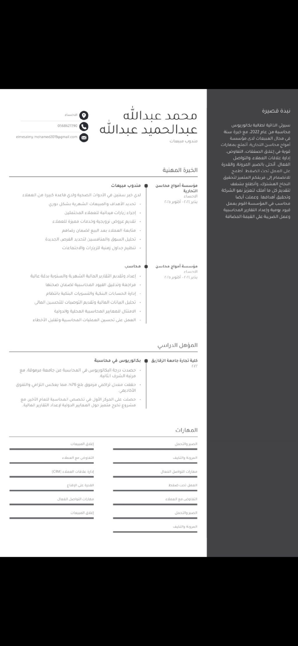 أنا اعمل مندوب مبيعات خبرة أكثر من سنتين في المبيعات الأدوات الصحية والكهربائية ولدي قاعدة كبيرة من العملاء واشتغلت في الاحساء ابحث عن فرصة عمل كويسة ومتاح لنقل الكفالة