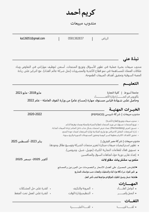 مندوب مبيعات محترف بخبرة في تحقيق المستهدف البيعي وبناء علاقات قوية مع العملاء أسعى للانضمام لشركة رائدة لاستثمار مهاراتي في الاقناع والتفاوض وتطوير الحصة السوقية. امتلك مهارات تواصل ممتازة، قدرة عالية على التحصيل، ومعرفة واسعة بأساليب البيع الحديثة